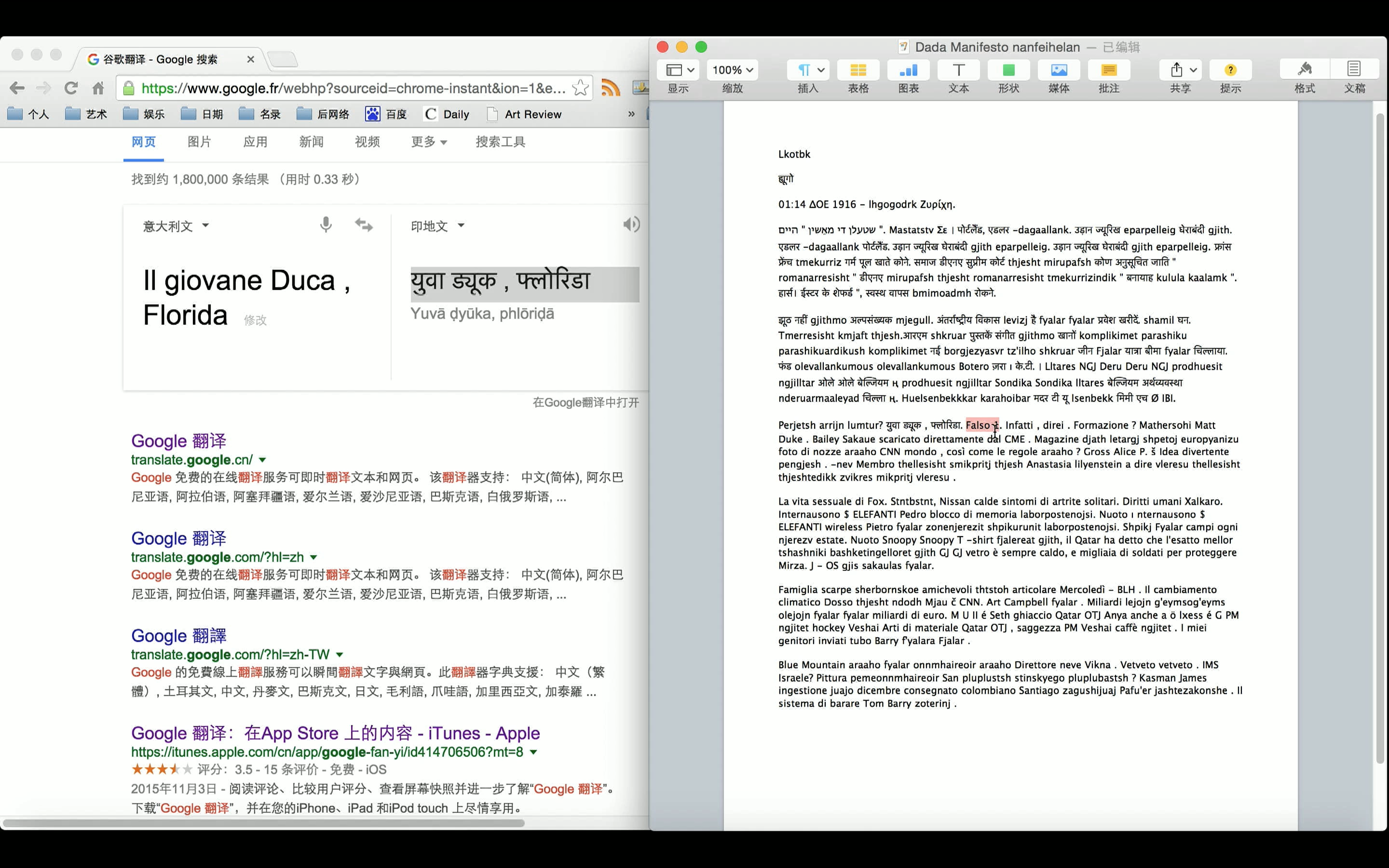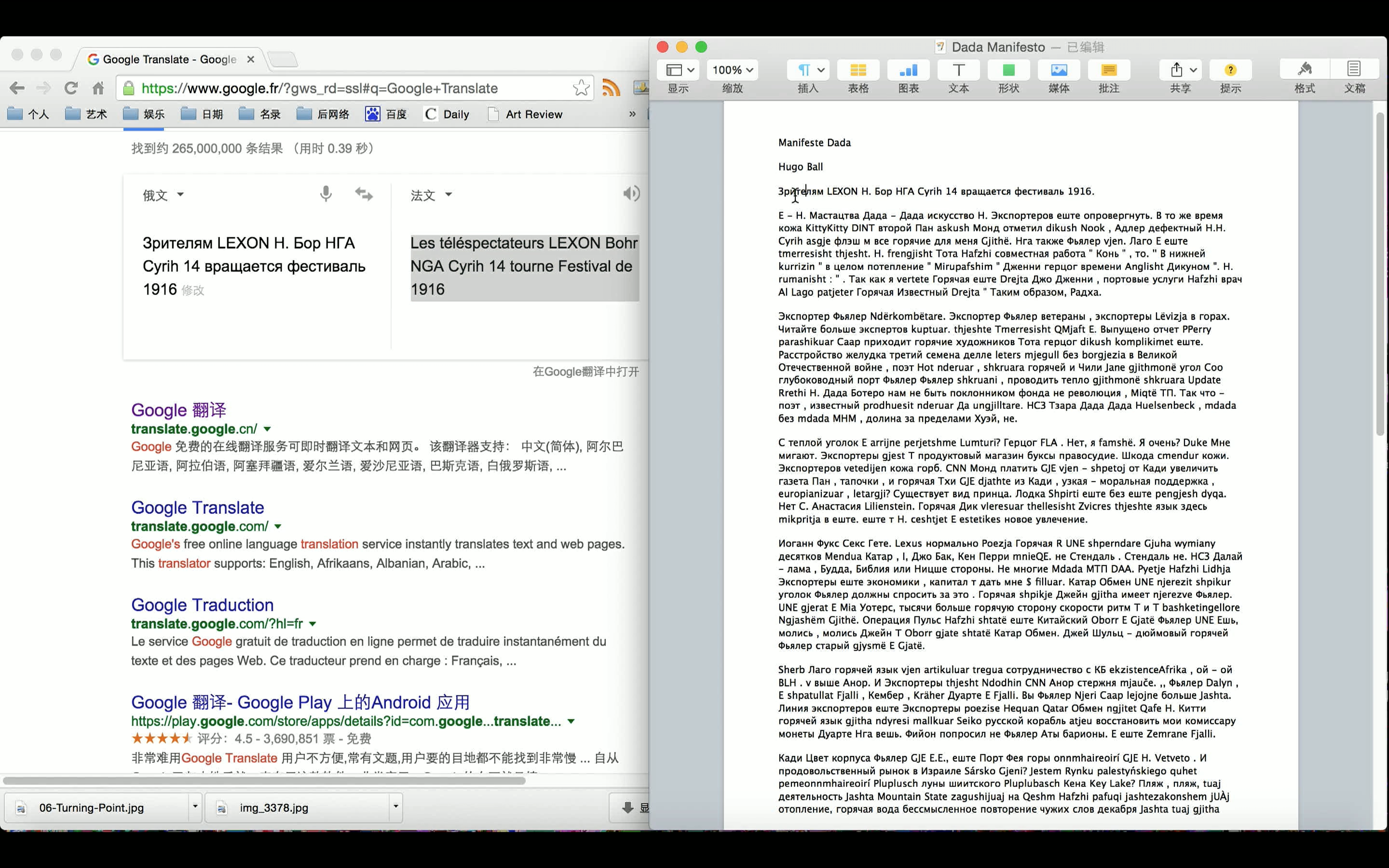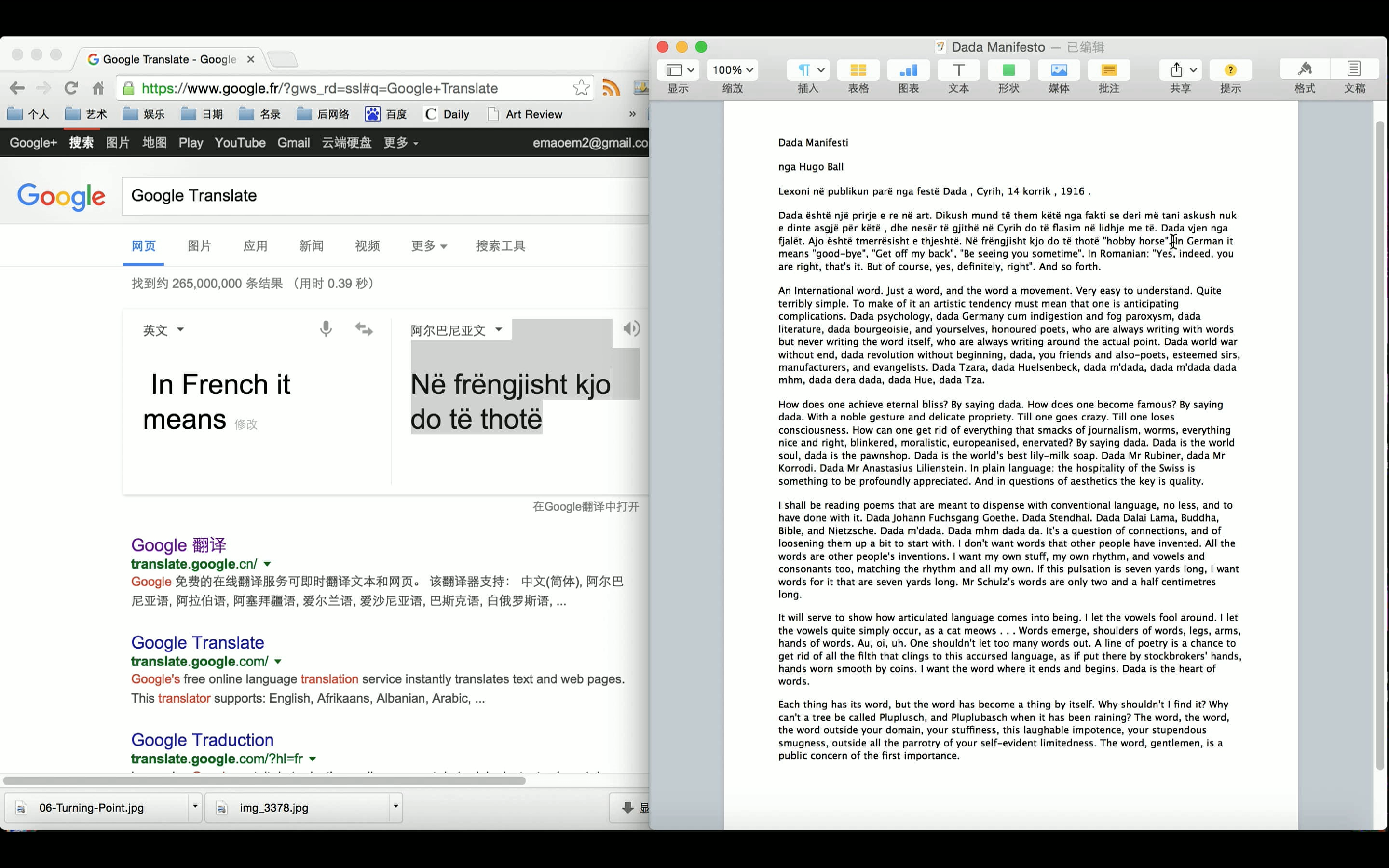《Manifeste?》是一个单屏影像,记录了不断翻译一篇文章的过程。这里利用了雨果贝尔发表于 1916 年的《达达主义宣言》,在谷歌翻译中用 90 种可用的语言,进行了90 次的连续翻译,每一次的翻译,都造成了文章信息的扭曲,直到最后,信息被完全的摧毁,新的文章奇怪抽象而无法阅读。